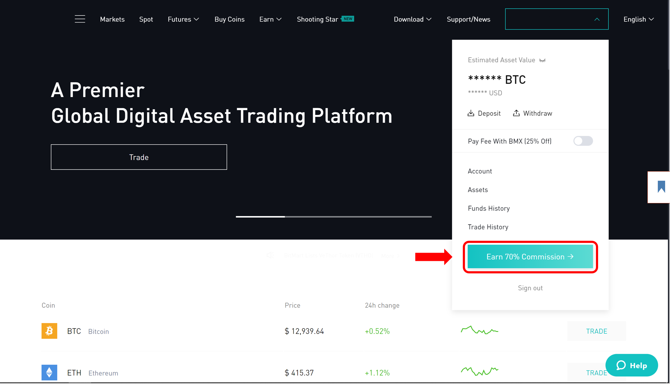 Step 2: For website users, after logging in, click [Earn 70% Commission] when hovering over your email address on the website. For APP users, login and click [Invite Friends] on BitVez APP.