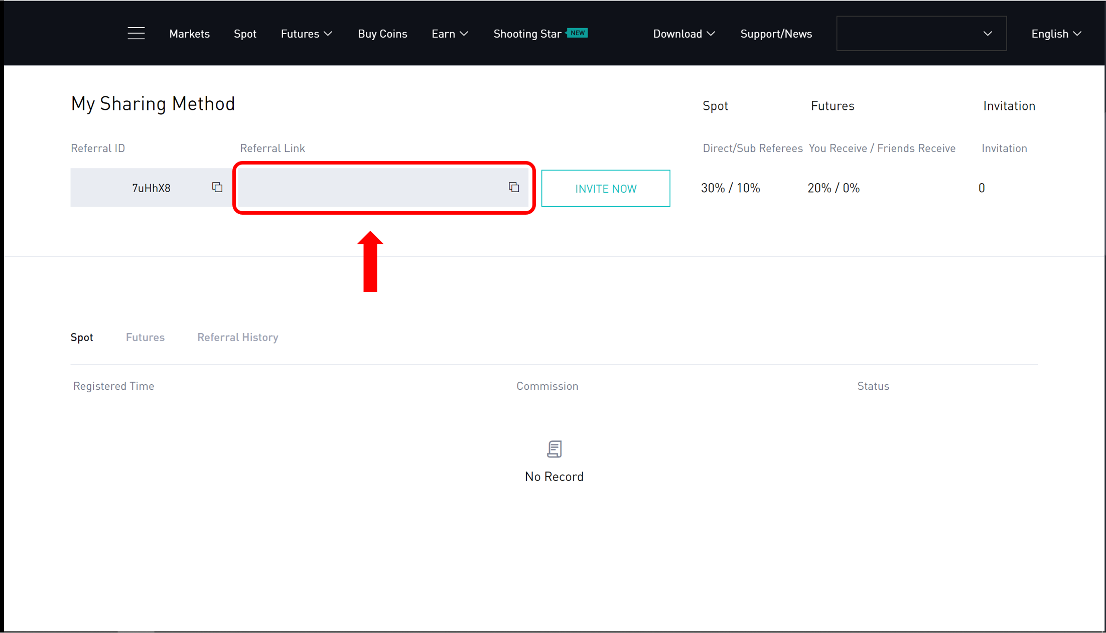 Step 3: For website users, scroll down to the [My Sharing Method] section. From this page you can copy your referral link and send it to your friends. For APP users, click [INVITE NOW].